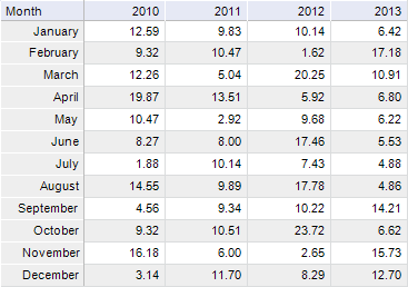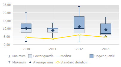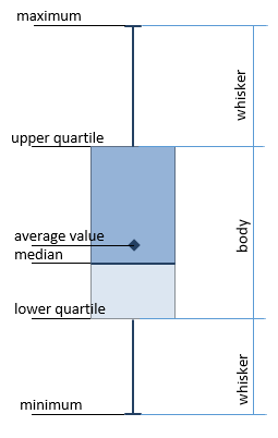 Box charts are used to analyze one or several data sets in the graphical view. This type of chart can be used to compare distributions between several data groups or sets. For each data group or data set the following calculations are made: center statistics (median, average) and range statistics (quartiles, standard deviations) for various periods of time and the selected values are displayed on the chart.