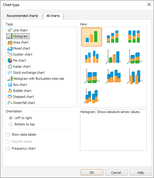 NOTE. On changing chart type the previously configured binding of series to secondary axis is saved for all chart types, except for the histogram with grouping and the stock exchange chart with the opening rate.