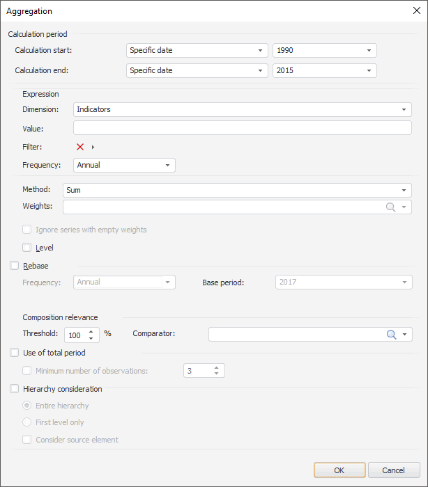 After the method is applied the Aggregation dialog box that is used to set up calculation parameters opens. For example: