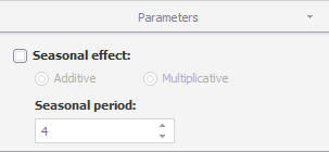 Seasonal Period. Determine the length of the seasonal period by means of the value editor or the keyboard. The parameter is used if any seasonal effect is specified.