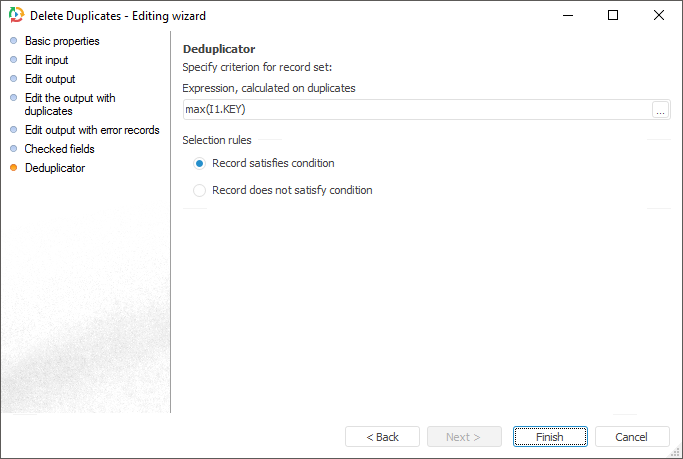 Set a condition, based on which records to be deleted are selected, on the Deduplicator page.