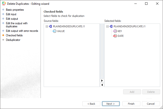 Set the input fields. which values should be checked for duplicates, on the Checked Fields page.