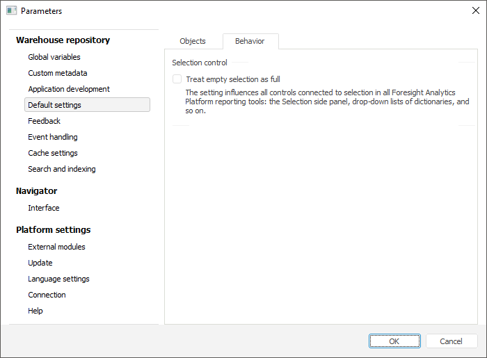 To set up behavior which will be used in the Foresight Analytics Platform tools, use the Behavior tab:
