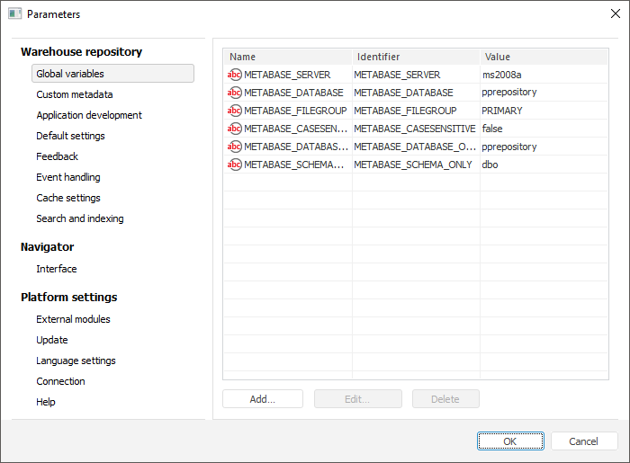 To work with global variables, use the Global Variables tab in the Parameters dialog box.