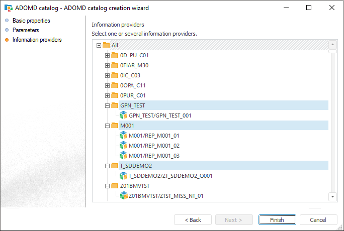 Click the Check Connection button. If connection is successful, click the Next button to go to the Information Providers page. On this page one select catalogs or information providers, and ADOMD catalog objects are created based on their information. By default, the All element is selected, all cubes created on server are created. If required, the list of created elements can be reduced, to do this, select required catalogs or separate information providers. The list of selected elements is saved, on updating the ADOMD catalog contents the information only about selected elements is updated.