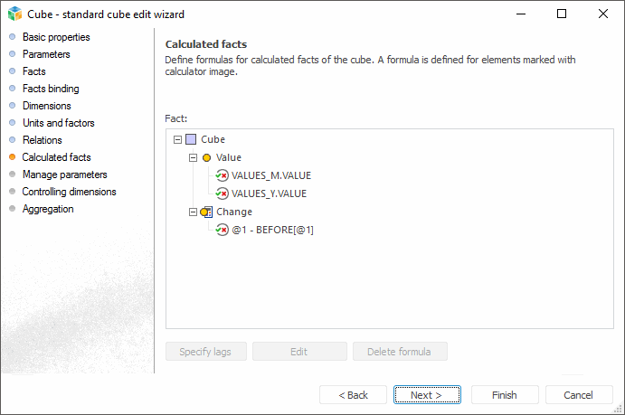The Calculated Facts page is used to set formulas for calculated facts. Calculated facts is a function from values of other facts, calculated facts or relations.