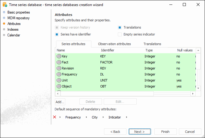 By default, time series database already contains a minimum set of series system attributes and observation system attributes. They are highlighted with green and their deletion is forbidden.
