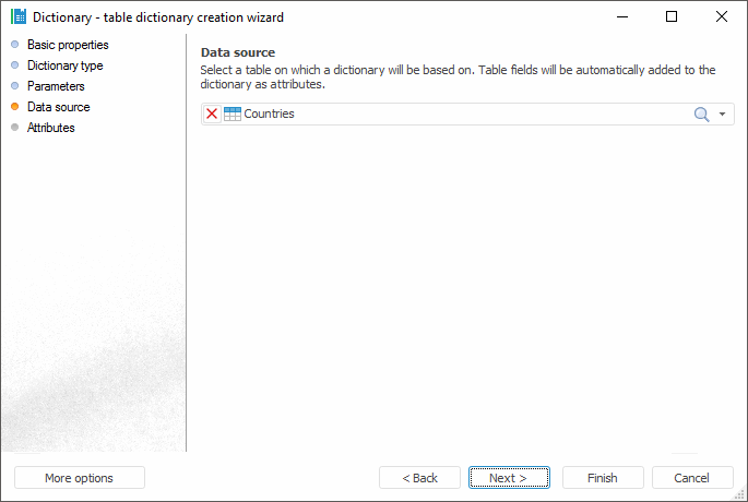 Table Dictionary. The dictionary is used for structured presentation of elements without the ability to add or edit them. To create a dictionary, a table data set or MDM dictionary is required. Each data source record is a dictionary element that must contain definitions of all dictionary elements. The user can use various filters to limit the amount of data, which is moved to the dictionary. A table dictionary can manage contents by means of parameters, that is, it is a dynamic dictionary. It can be created in any place of the repository: