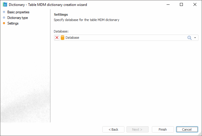 Table MDM Dictionary. The dictionary is used for creating a structured data presentation with possibility of its transformation. Creating a dictionary does not require a data source. Data can be entered manually or loaded from the data source to the dictionary by means of the built-in ETL tools. Dictionary elements may change in time, that is, may have several versions. Table MDM dictionary can be created in any place of repository, not only in the MDM repository. A table MDM dictionary that uses a single table to store data. A table is created automatically on creating a dictionary and is the dictionary child object. The table fields correspond to the dictionary attributes. Creating a table MDM dictionary requires a database to store dictionary data that is located outside the MDM repository: