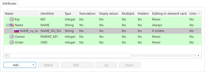Go to the Description tab and click the Save button. Child translation attributes are created on this table for string attributes. The number of child attributes corresponds to the number of languages, into which MDM dictionary is translated. Identifiers of these attributes consist of the identifier of the parent attribute with added suffix (international abbreviation of the language).