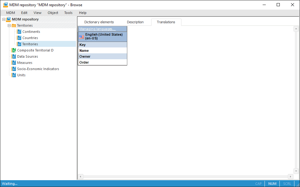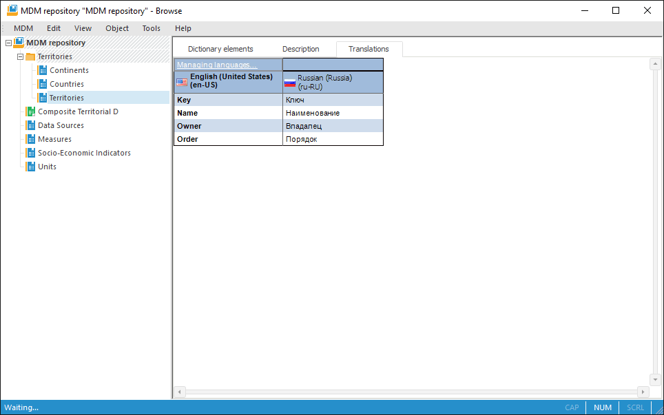 The desktop application enables the user to create multilingual MDM dictionaries, that is, dictionaries that contain translation of attributes and elements into different languages. These dictionaries support displaying in different languages in the desktop, web and mobile applications. If a multilingual MDM dictionary is used as a dimension in a cube or time series database, on changing of user repository language elements of the corresponding dimension are displayed in the selected language.