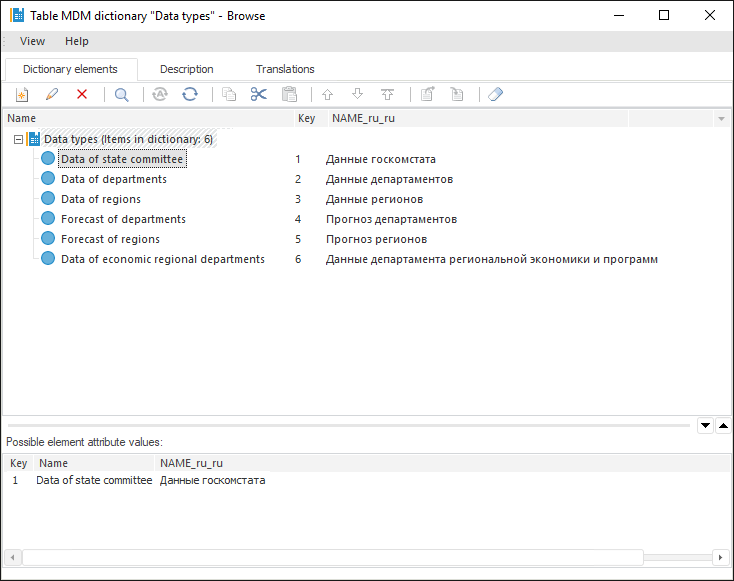 Thus, a multilingual MDM dictionary is created. Working with elements of a multilingual dictionary is the same as working with elements of standard MDM dictionaries. The difference is that on entering values of the string attributes for the elements you need to specify the language, for which the value is used.
