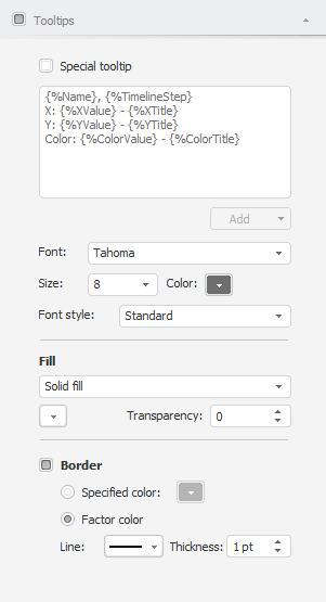 Tooltips are enabled by default. To make tooltips visible, select the checkbox in the Tooltips tab title on the side panel. To set up tooltips, use the same side panel tab.