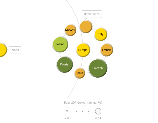 A bubble tree allows hierarchical data to be displayed as a set of interrelated bubbles. Each hierarchical branch is represented with a bubble related with bubbles that are elements of the same hierarchical level. All elements of the same branch and the same hierarchical level form a circle, the center of which shows the parent element of the hierarchy. Each bubble's diameter is proportional to the value of the corresponding hierarchical element. Bubble color also depends on value of the hierarchical element.