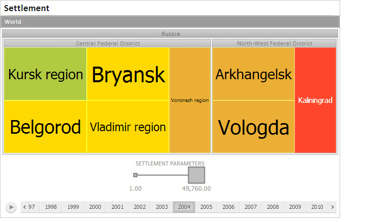 A tree map allows hierarchical data to be displayed as a set of nested rectangles. Each hierarchical branch is represented with a rectangle that consists of smaller rectangles, which are subbranches. Area of each rectangle is proportional to value of the corresponding hierarchical element. Rectangle color also depends on value of the hierarchical element.