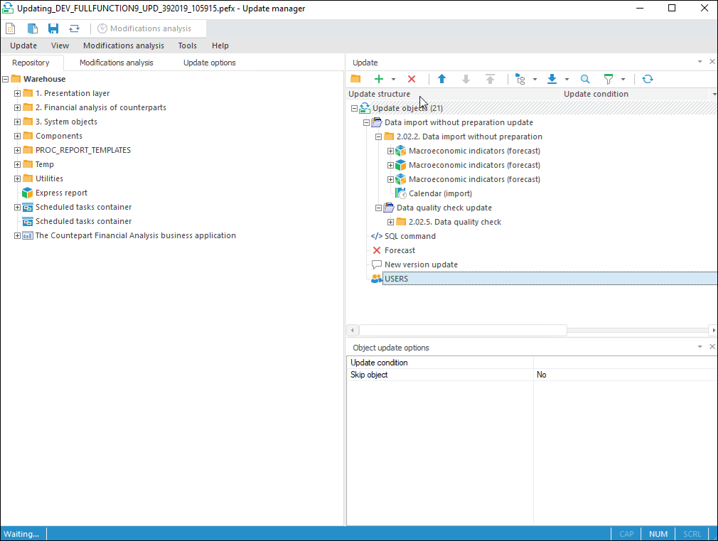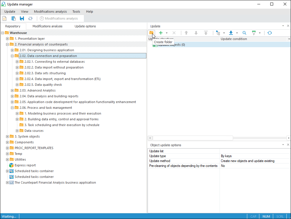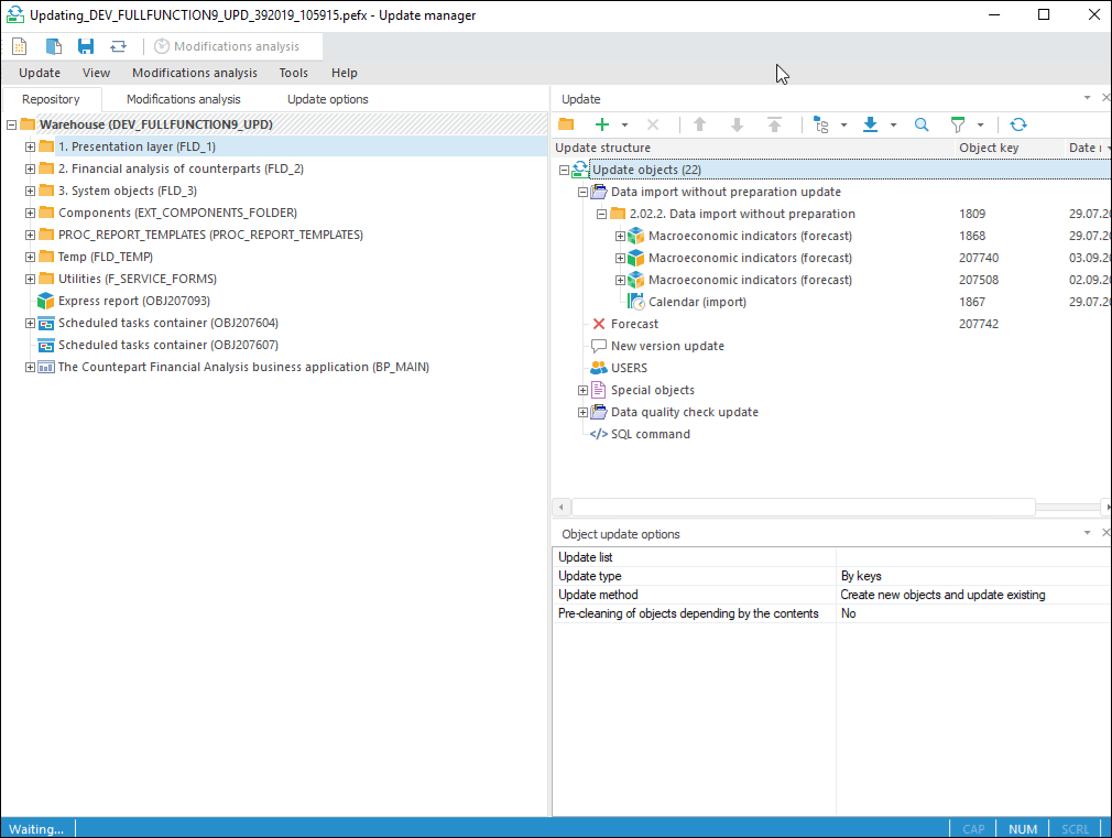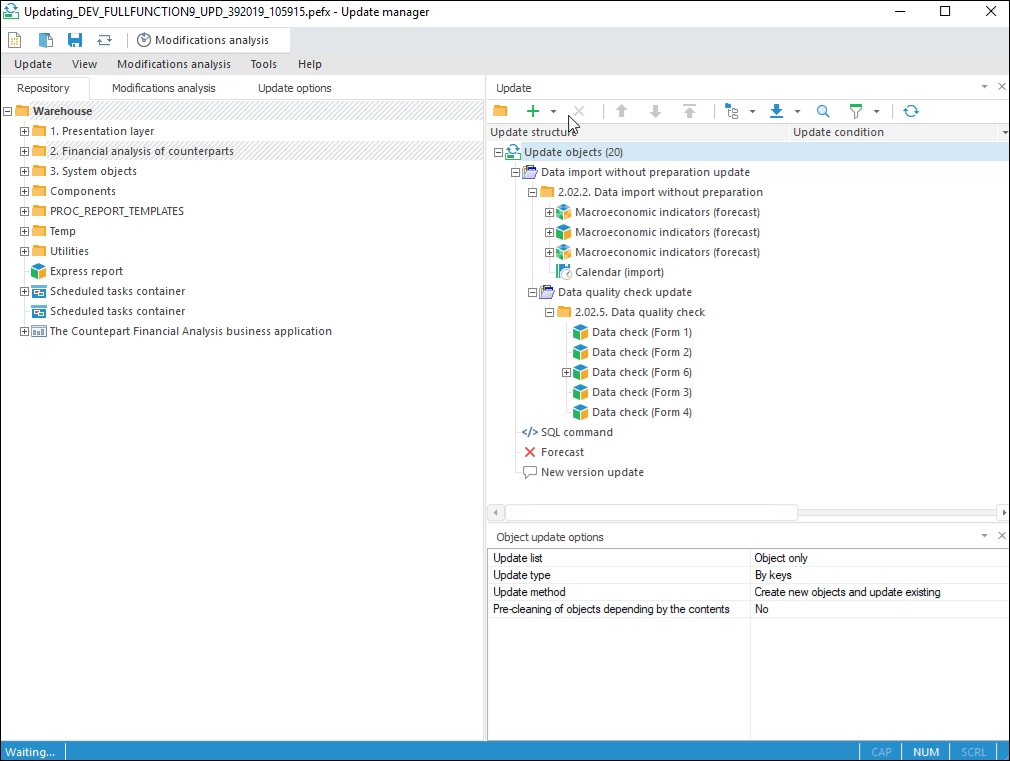To create an update, open the repository as an administrator who is responsible for synchronization of objects between repositories or application systems synchronization of Foresight Analytics Platform developers and end users, or under the account of Administrators group member account.