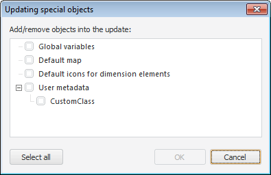 Select the checkboxes next to the special objects, which should be added to update, in the hierarchical list.