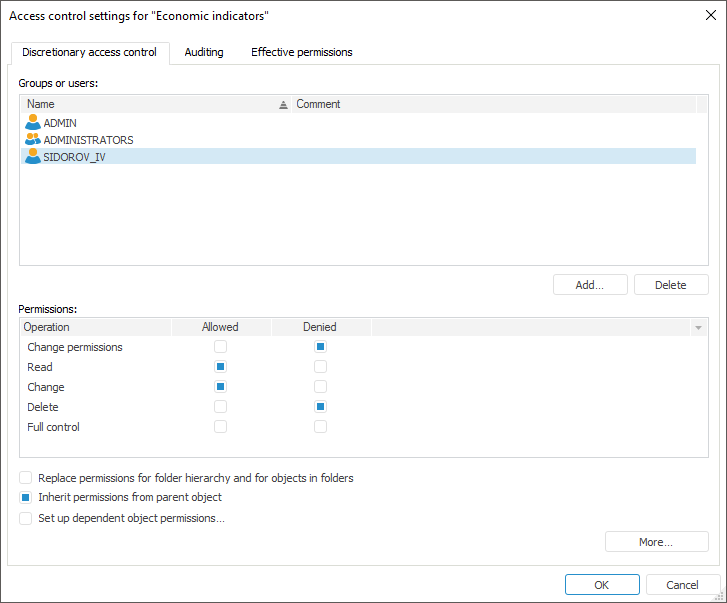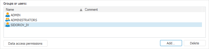 The Groups or Users box displays a list of security subjects that have permissions to execute operations with objects. If the subject is selected in the Permissions or Permissions for Selected area in the desktop application, a list of access permissions by general operations (edit permissions, read, edit, delete) is displayed in the web application that can be separately changed for each security subject.