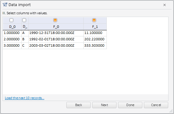 The page for defining the columns that contain values is the second stage of the data import wizard:
