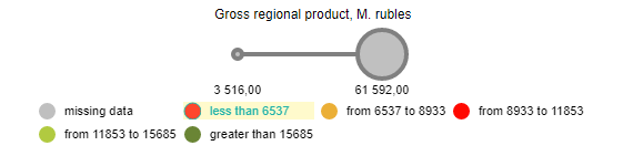 To execute the example, the HTML page must contain the BubbleChart component named bubbleChart (see Example of Creating the BubbleChart Component). Set new values for the following properties of value intervals legend: format of intervals with left, right and both borders, position and text of the element that corresponds to missing data in visualizer, color and transparency of legend elements highlighting brush, color of highlighted elements. Enable legend elements highlighting, set highlighting on click:
