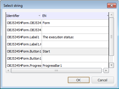 All string elements of the resources connected to the form are contained in this dialog box. The value of identifier and the value for default language are displayed for each element of resources. Click the OK button after selection of new string element.