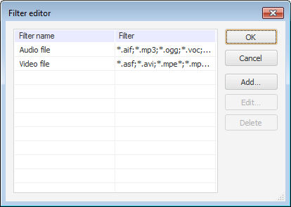 Filter:="Audio files|*.aif;*.mp3;*.ogg;*.voc;*.wav;*.wma|Video files|*.asf;*.avi;*.mpe*;*.mpg;*.mpg4";