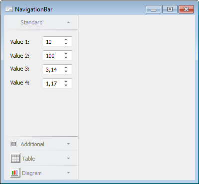 Use software to create a collection of tabs for setting up the component. To create a tab, create an instance of the NavigationBarPad class and include it in the Pads collection of the NavigationBar component. For each tab set up a title (the INavigationBarPad.Header property) and a panel (the INavigationBarPad.Content property). A title can include text and a control. The panel associated with the title is a frame for the form with controls. The form identifier is specified in the INavigationBarPanel.MetabaseObject property.