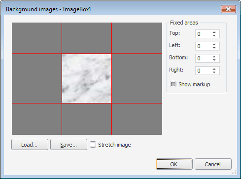 The Display Area checkbox controls displaying red lines separating fixed image area from zoomed areas. Fixed areas are displayed in the same way as in the source file. The rest of the image area is zoomed in accordance with sizes of the ImageBox component. The size of the fixed area is specified in pixels and depends on the sizes of the loaded image.