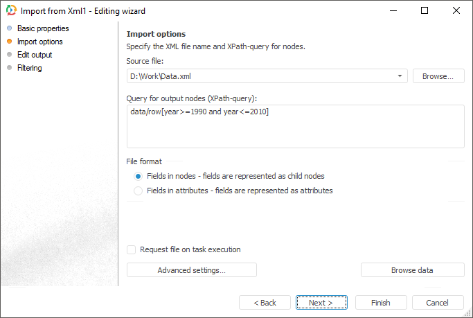 If the Request File on Task Execution checkbox is selected, the dialog box for selecting an XML file opens on executing an ETL task. The checkbox is deselected by default, working is executed with the file that is specified in the Source File box.