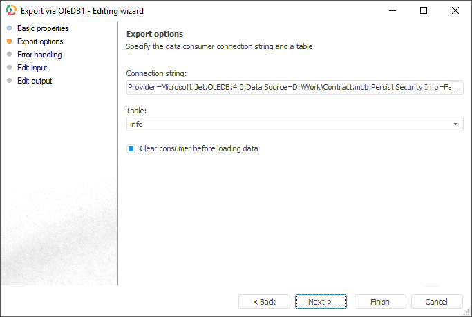 After adding the connector to the ETL task workspace, set basic properties and export options. The connector input and output can be also edited, and error handling parameters can also be set.