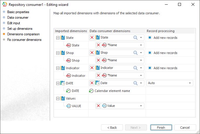 To link dimension with existing dictionary, select dictionary in the drop-down list next to required dimension. The following items are available for selection: