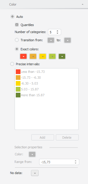 NOTE. On setting up the scale take into account the following feature: boarding values are always included into scale smaller interval. For example, there is a scale with three intervals: less than 25, from 25 to 50, more than 50. The 25 value will be included into the less than 25 interval and the 50 value will be included into the from 25 to 50 interval.