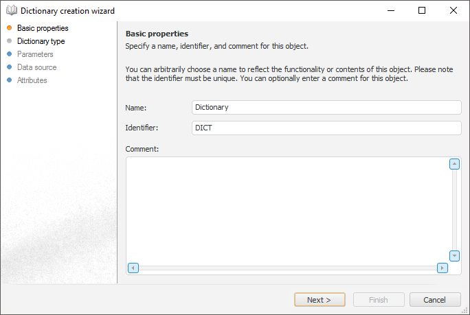 The Basic Properties page is used to specify the object name, identifier and comment.
