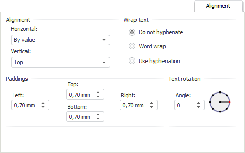 The Alignment tab is used to determine value position in the cell. Cell value can be aligned horizontally and vertically with selected rotation angle and paddings from the cell borders. Wrap method can also be selected for string values.