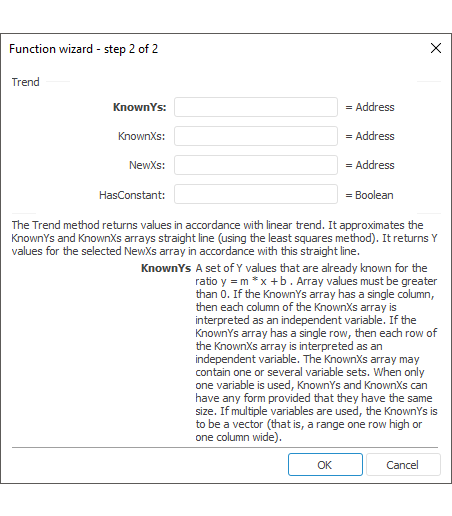 NewXs. New X values for which the Trend method returns corresponding Y values. Like KnownXs, NewXs must have a column or a row for each independent variable.