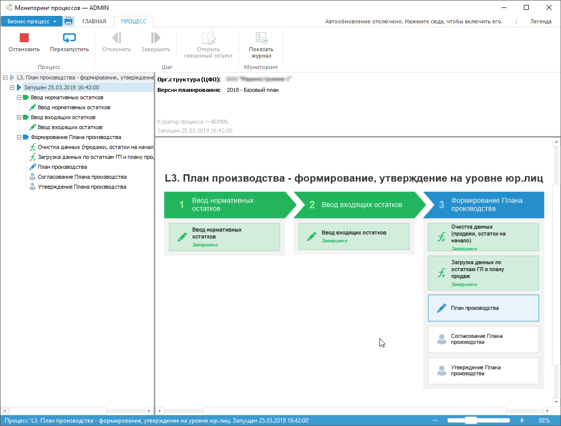 Примечание. Для просмотра цветовой индикации статусов выполнения процесса воспользуйтесь командой «Легенда» главного меню.