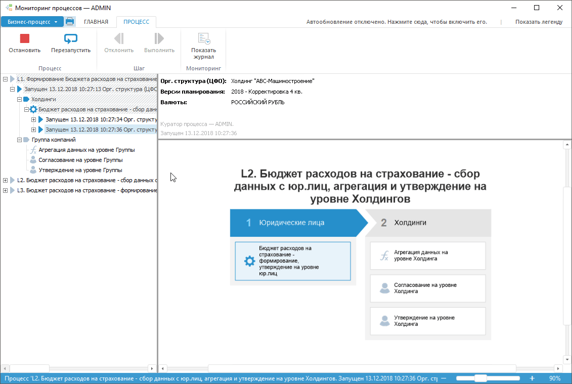 Для подпроцесса «Бюджет расходов на страхование – формирование, утверждение на уровне юр.лиц» с автоматическим способом исполнения экземпляры вложенных подпроцессов запустятся автоматически: