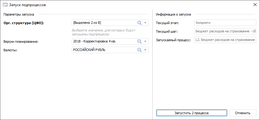 В окне «Запуск подпроцессов» в области «Параметры запуска» по умолчанию подставляются значения, для которых будут запущены подпроцессы: