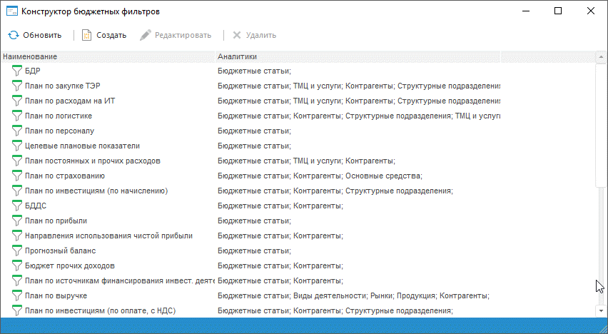 Конструктор бюджетных фильтров предназначен для создания и настройки бюджетных фильтров, которые используются для формирования структуры бюджетных форм.