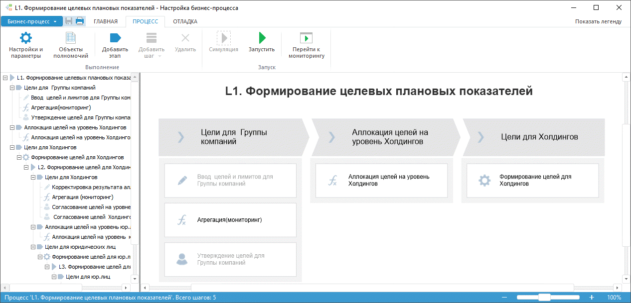 • настройка общих параметров процесса и отдельных параметров шагов процесса;