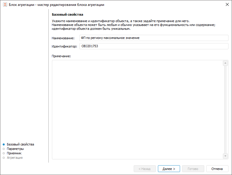 Настройка базовых свойств блока агрегации выполняется на странице «Базовые свойства» в мастере редактирования блока агрегации:
