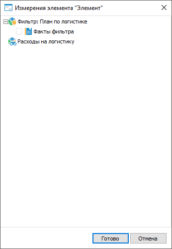 Добавьте частные измерения показателей, значения которых будут использоваться в вычислениях. Для этого выполните команду «Выбор измерений» контекстного меню показателя. Будет открыто окно для выбора частных измерений показателей: