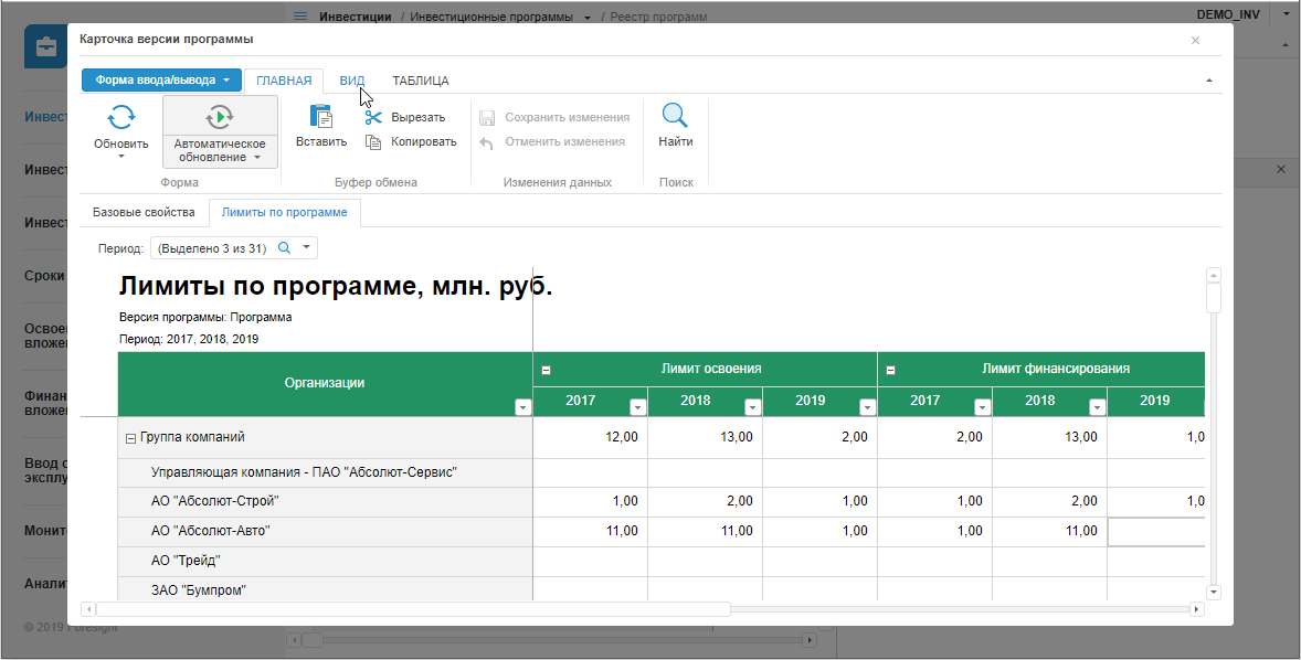 Реестр программ представляет собой интерактивную форму ввода данных, содержащую список версий инвестиционных программ для выбранных типов программ и периодов.