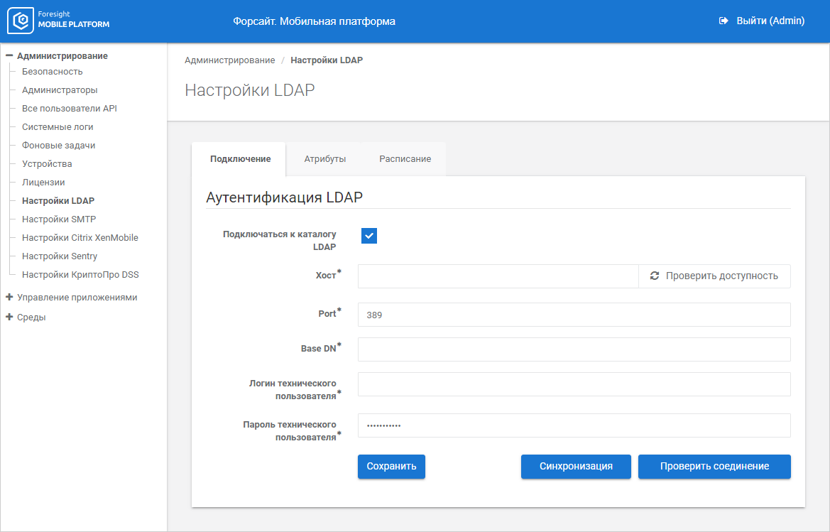Для настройки взаимодействия со внешней LDAP-системой используйте подраздел «Настройки LDAP»: