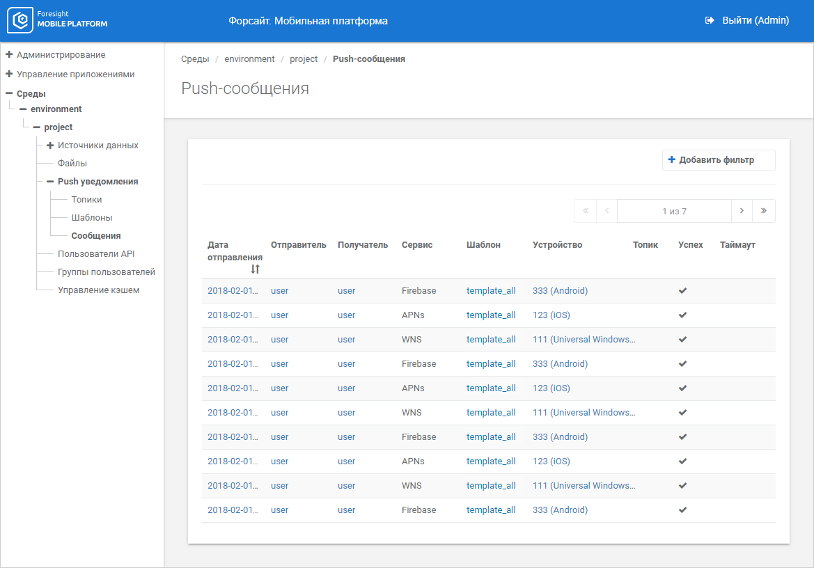успешная рассылка push-уведомлений в виде флажков, если сообщение дошло до сервиса и было принято им как корректное;
