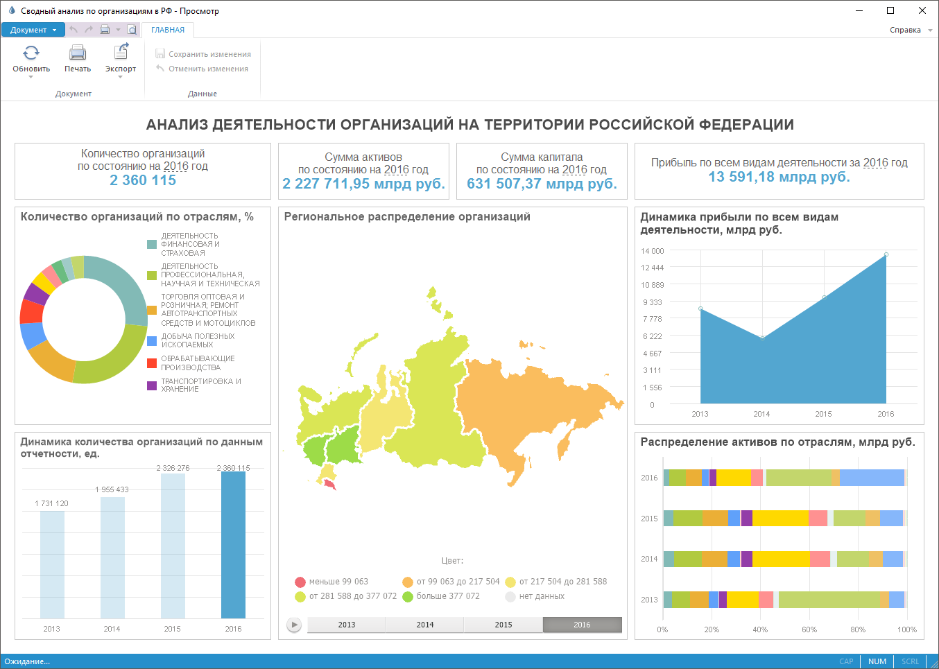Объект «Первичная и аналитическая отчетность» содержит примеры аналитических панелей для удобного представления информации из различных источников.