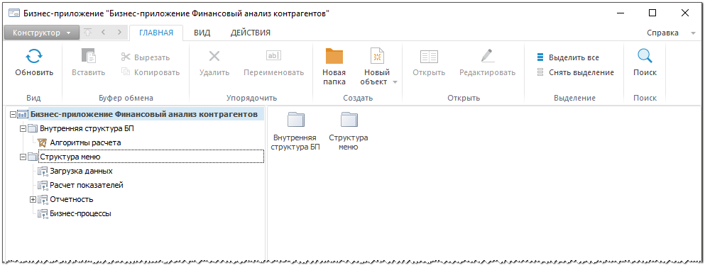 Объект «Бизнес-приложение Финансовый анализ контрагентов» предназначен для ознакомления с бизнес-приложением, созданным с помощью инструмента «Конструктор бизнес-приложений». Для открытия примера щелкните мышью по его названию в окне приветствия или откройте на просмотр в навигаторе репозитория. Пример будет открыт в режиме построения бизнес-приложения в настольном приложении инструмента: