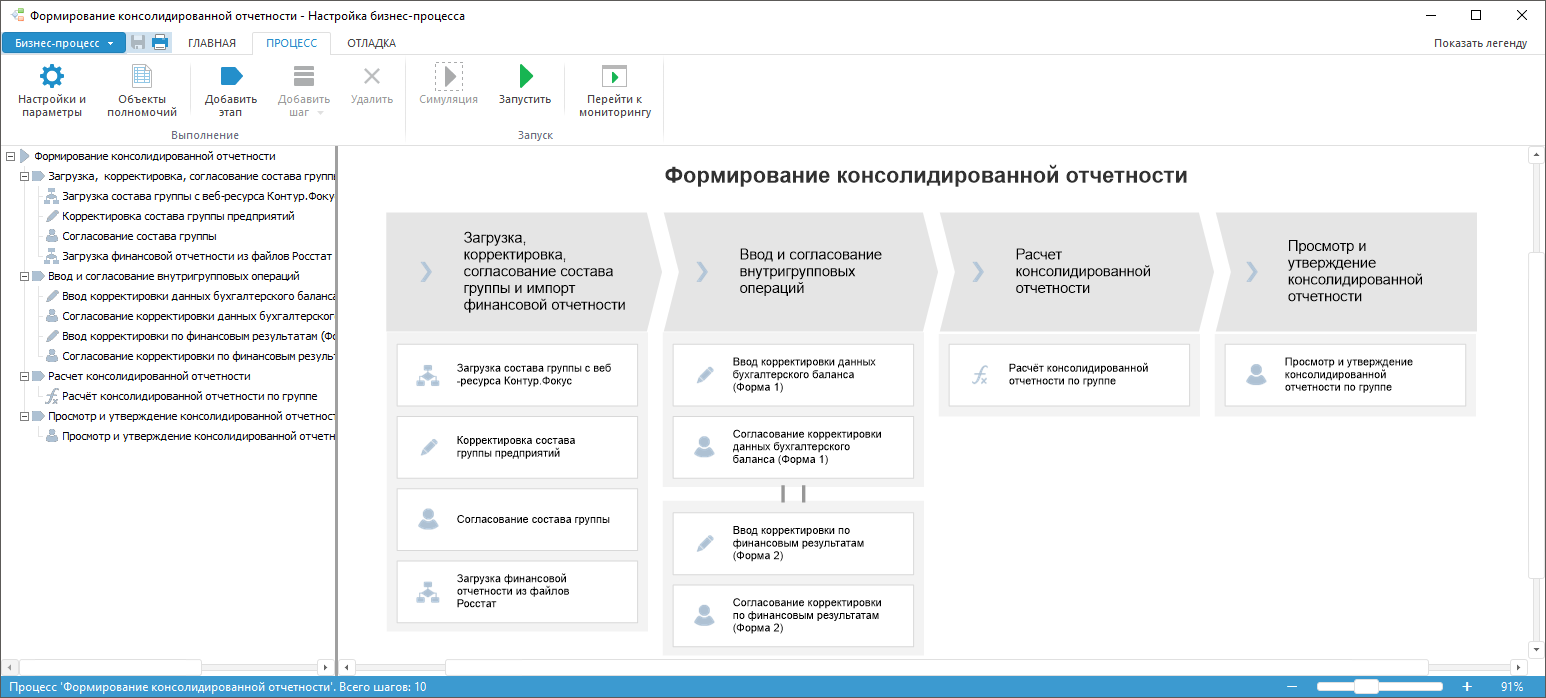 Объект «Формирование консолидированной отчетности» - это бизнес-процесс, который решает задачу формирования, корректировки и анализа консолидированной отчётности по группе организаций: