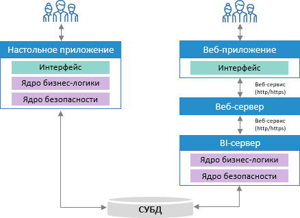 При использовании веб-приложения функции бизнес-логики и безопасности выполняет BI-сервер, пользовательский интерфейс представлен веб-приложением: