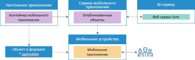 2. Веб-приложение взаимодействует с веб-сервером и BI-сервером, через точку доступа PP.SOM.Som. Схема отображает обобщенное взаимодействие, подробная схема приведена в разделе «Установка и настройка серверной части веб-приложения».